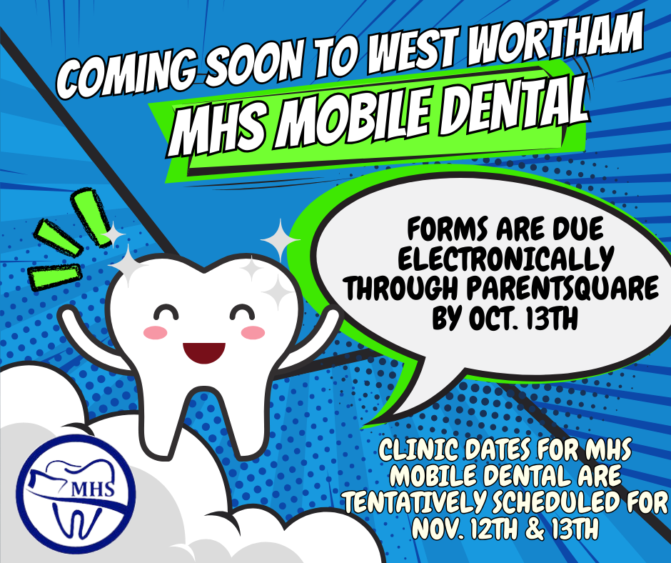 MHS MOBILE DENTAL is now taking applications for their annual clinics at West Wortham. Attached is the consent form you must fill out electronically for your student to participate in this program. These screenings are done voluntarily and only with consent of the legal guardian(s). Electronic forms must be complete and turned in no later than Oct. 13th. Clinic dates are tentatively scheduled for November 12th-13th and are subject to change.